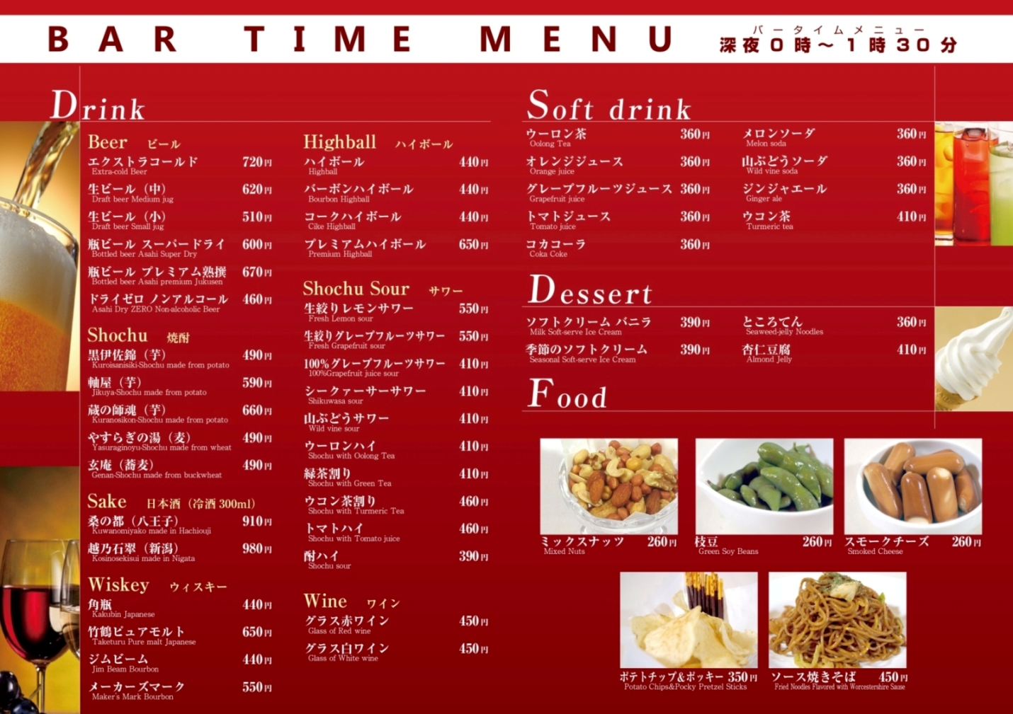 ※午後9:00時~深夜0:00まではナイトメニュー、深夜0:00~深夜1:00までは